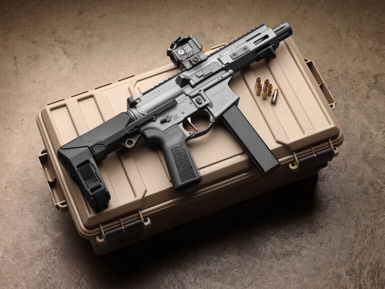 Chambered for 9mm, the Saint Victor PDW features a 5.5-inch barrel, a retractable SB Tactical HBPDW pistol brace and a simple but reliable direct-blowback action. It feeds from Colt-pattern magazines and has a standard capacity of 32 rounds.
