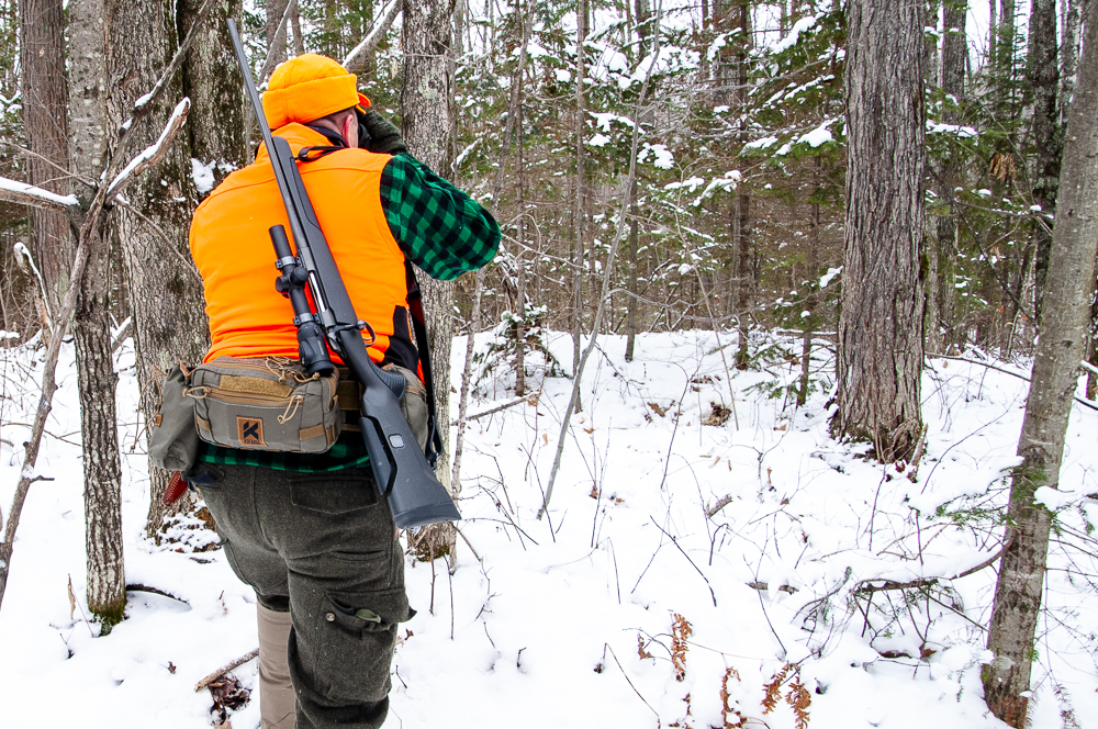 After arriving up north for my hunt, the first thing I noticed about the Kifaru Rogan was how easy it was to snap on and off, and how sturdy it was. The wide, insert-reinforced Battle Belt locks around you, and the load does not shift. It doesn’t flop like cheap so-called fanny packs. Since I would be walking several miles tracking bucks in the snow, the outfit needed to be rock-solid.