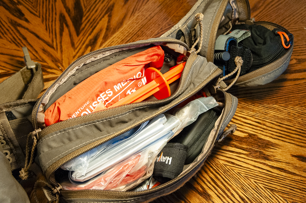 Attached via mil-spec webbing on the right side is a Mini Belt Pouch that holds my quick-access essentials—a Cat-5 Tourniquet and a Streamlight headlamp. On the opposite side (left hip) is a large water bottle pouch that fits the Nalgene bottle perfectly.