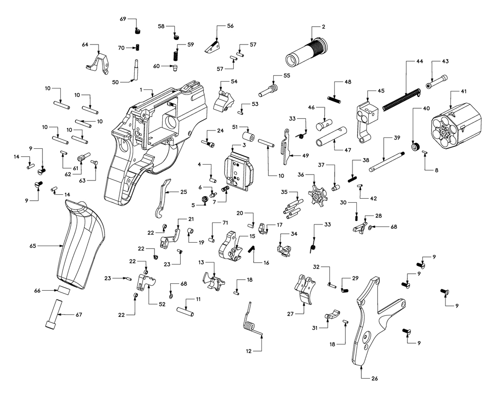 The mechanism is far different from that of conventional revolvers, as you would expect. Pulling the trigger moves an interlink lever by means of a connecting rod. This lever in turn moves both the hammer and the cylinder rotation pin, compressing a spiral spring through two levers. The interlink lever drives these two levers to push on the two spring ends which then propel the hammer and return the trigger and the rest of the mechanism to rest.