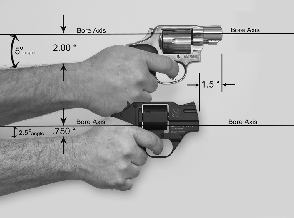 This also aids in putting the recoil more in line with the arm, instead of having the axis of the recoil above the hand as in a conventional revolver. Thus you don’t have the muzzle flipping up like that of a conventional revolver. The layout of the revolver results in its being 1 1/2 inches shorter in overall length than conventional revolvers with the same barrel length. Its imprint under clothes or in a pocket for the 2-inch barrel model is not as easily recognizable as a handgun as a conventional revolver is.