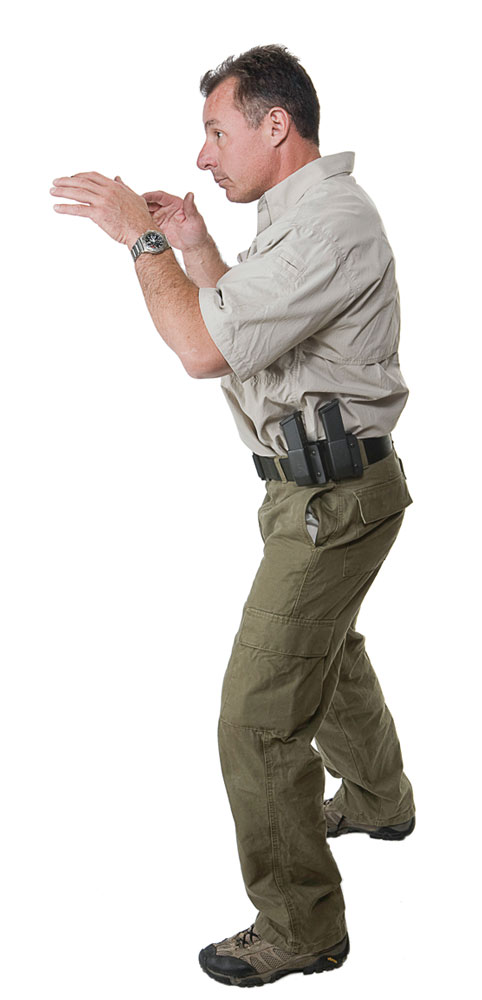 This fundamental of shooting is always important; it is the foundation for your shooting platform. For combat-type shooting, the stance should be solid, yet potently ready for movement. This stance looks like a fist-fighter’s stance. This stance should be very similar to your shooting stance for tactical carbines and shotguns and with the empty-hand martial arts. The less you have to change for different weapon systems, the more natural it will be. Make this stance a habit.