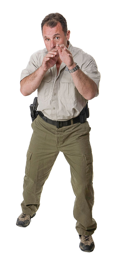 The arms form two sides of a triangle, your back the third, with your arms taking equal pressure in your position. The elbows are just under a full lock (keep it comfortable) to assist in allowing the recoil to go through the arms into your chest to help manage recoil. You may have to modify this grip and your elbows slightly as everyone has different hands, physical dimensions, and different pistols have various grips. Your grip must be consistent and comfortable. This isosceles of the arms is more natural to maintain under extremes than some forms of the Weaver technique. Train to use your natural instincts, not to counter them.
