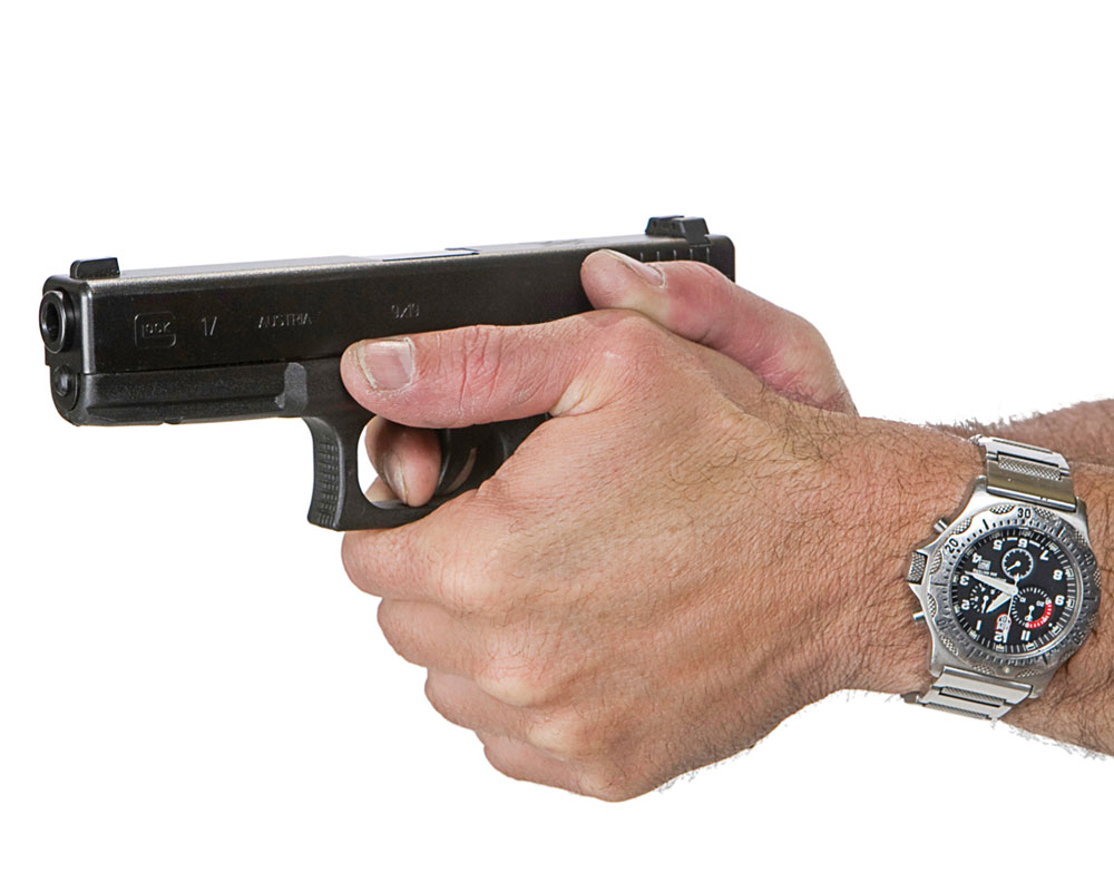 Try to apply most of the tension to hold the pistol with your non-firing hand, which allows you to relax your firing hand and obtain greater control with your trigger finger. My rule is a 70/30 ratio of non-firing hand to firing hand tension. Others think that equal pressure (50/50) is more easily learned and works well for some.