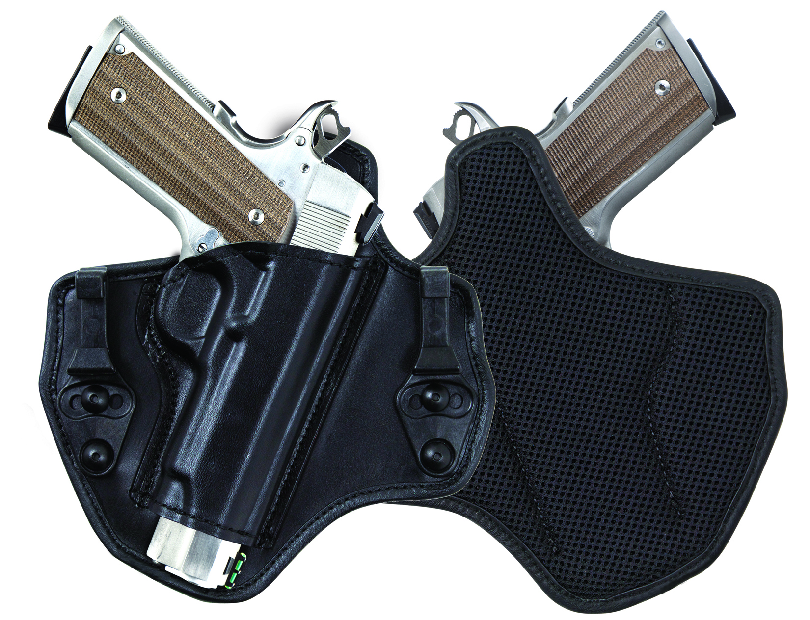 Meanwhile, two shirt-tuckable C-clips grasp the belt and, taking as little real estate as possible, give the appearance of an empty belt. The gun cant is optimized to put the grip into the kidney area of the back, minimizing any visible printing. Comfort is enhanced with a body-facing holster liner composed of soft foam covered with an anti-microbial mesh coating to reduce bacteria growth and odor.